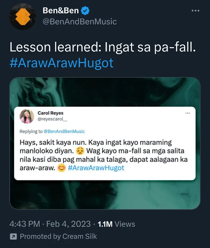 The brand recently launched its hashtag campaign #ArawArawHugot on Twitter and encourages followers to share mellow and heartfelt stories about their love life by replying to Ben&Ben’s official Twitter account.