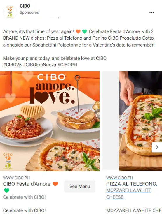 If customers don’t have time to prepare home-cooked meals, there’s always an option to dine out. CIBO’s Facebook advertisement features their new dishes on their menu using carousel ads which are a good way to showcase more than one product for better traffic and engagement.