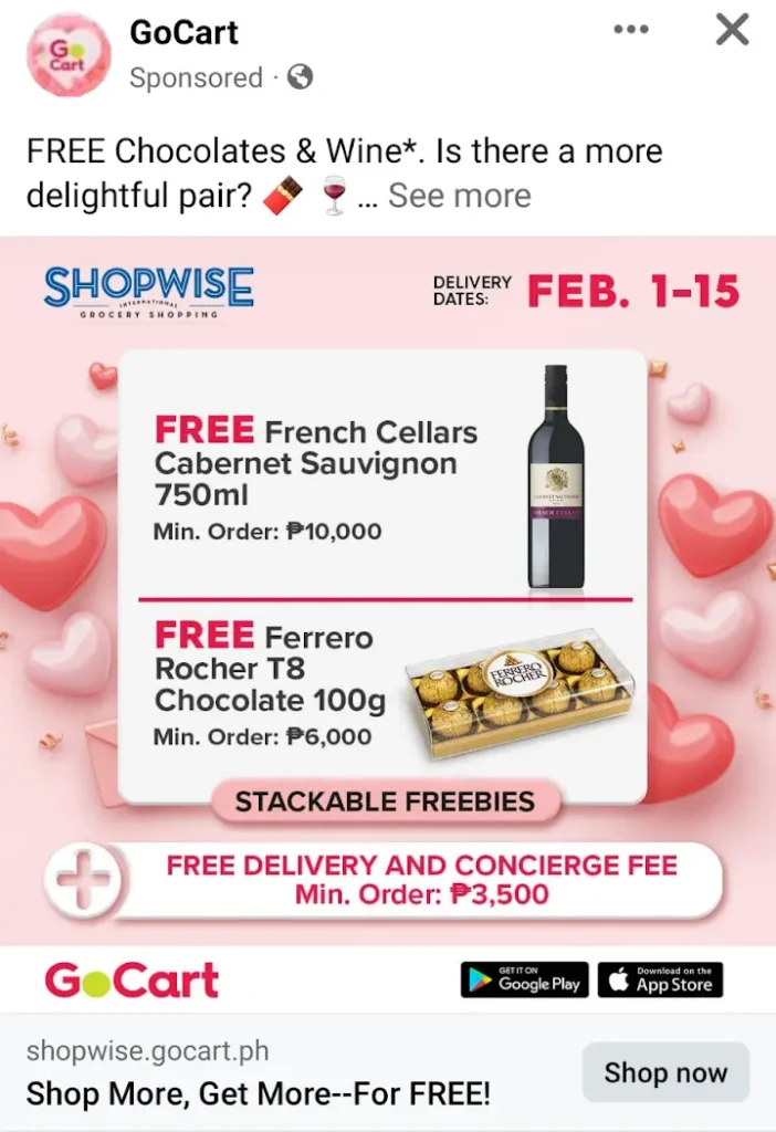 It’s a perfect match! Shopwise is in to give customers a hefty deal. For the special season, customers can get the perfect pairing of wine and chocolate if they shop on their website and purchase an order with a total minimum amount of ₱3,5000. Creating irresistible offers such as free stuff as featured in the ad is always good if brands want to make a good amount of sales this season.