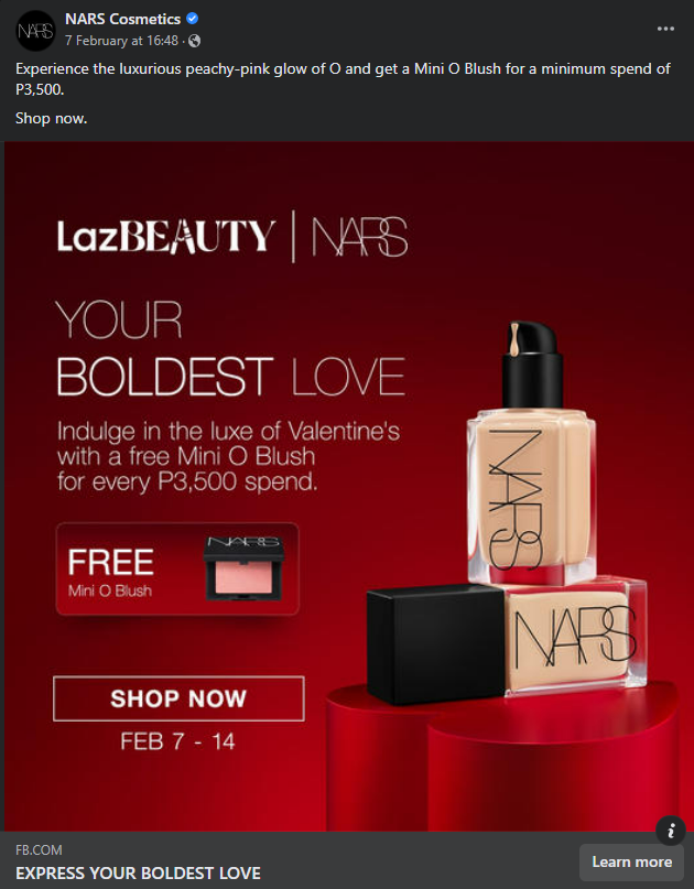 There are many ways to express love. For NARS, it can be bold. This promo advertisement for LazBeauty Valentine’s Day sale features an effective use of the color deep red which represents being bold.