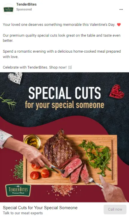 Special occasions are the perfect excuse to indulge in food cravings. That is how TenderBites is encouraging their customers to do so. Their Facebook ad creative showcases their premium cuts of steaks which perfectly match its image headline: “Special Cuts for Your Special Someone.”