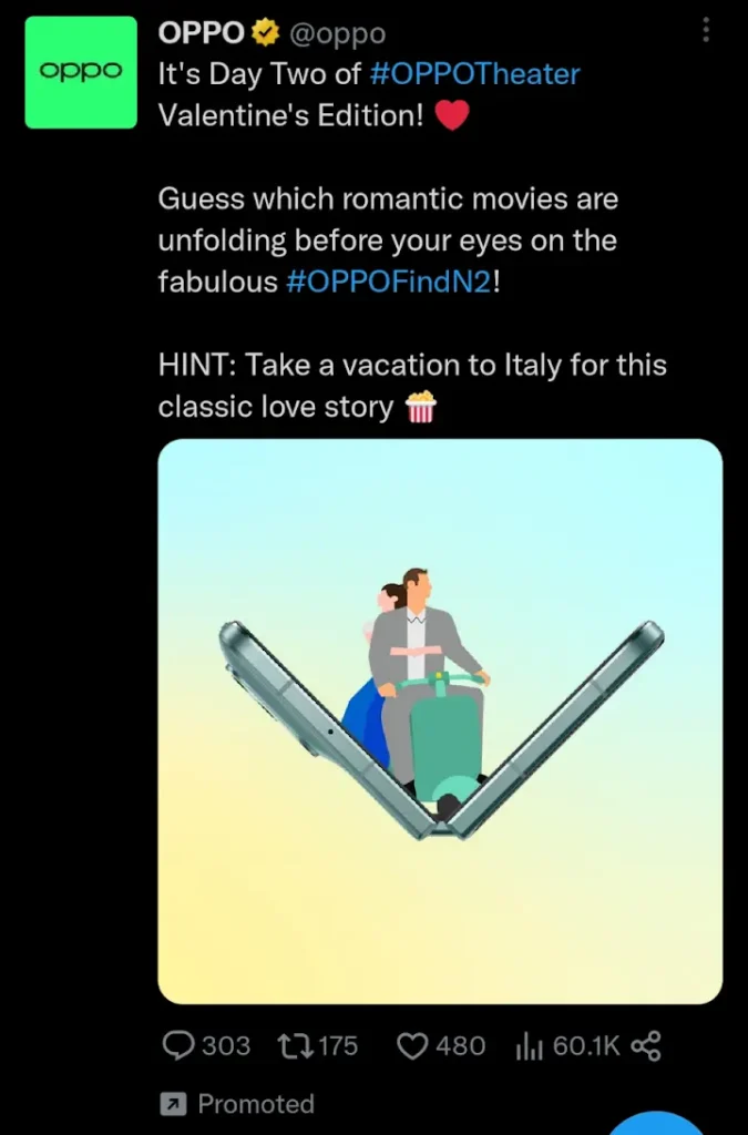 Just in time for the product launch of their new Find N2 Flip, smartphone brand Oppo revamps their hashtag event #OPPOTheater to celebrate Valentine’s day. For this round of event, the brand tunes in with its audience on Twitter to guess three all-time classic romance movies to boost brand engagement.