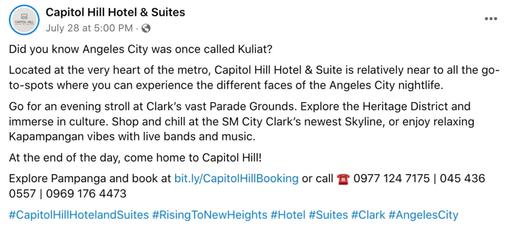 Capitol Hill Hotel & Suites in Angeles City has content promoting tourist attractions in the city, Clark Freeport Zone, and Pampanga while highlighting cultural and traditional activities on their social media.