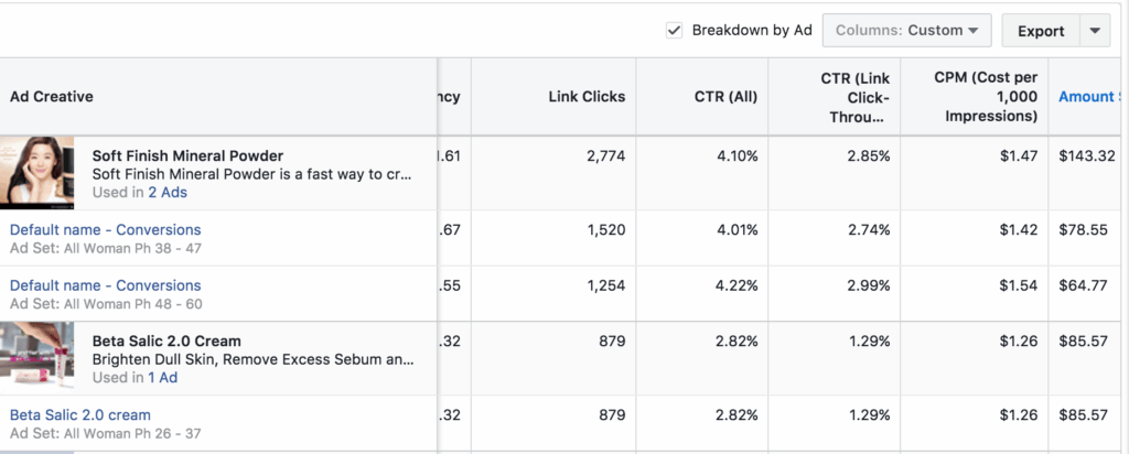 You can also break it down by Ad which means you’ll see which creative performs well in your targeting.