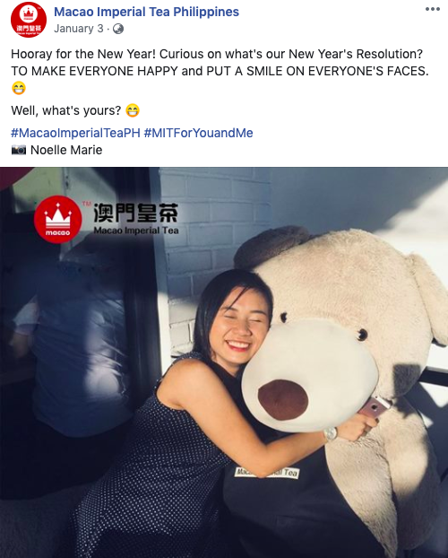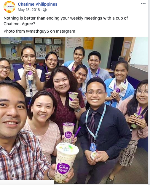 Below is an example of a post that focuses on people, Chatime showcase their people-centric post by featuring a curated post from one of their customers.