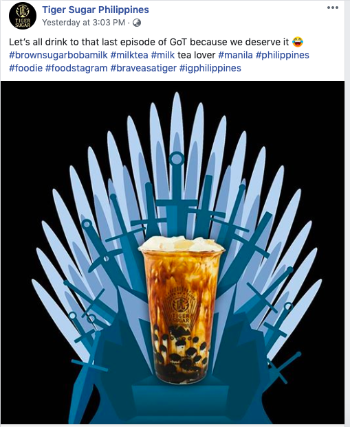 In this post of Tiger Sugar Philippines, they put the pop in popular culture by featuring Game of Thrones in their Milk Tea Advertisement.