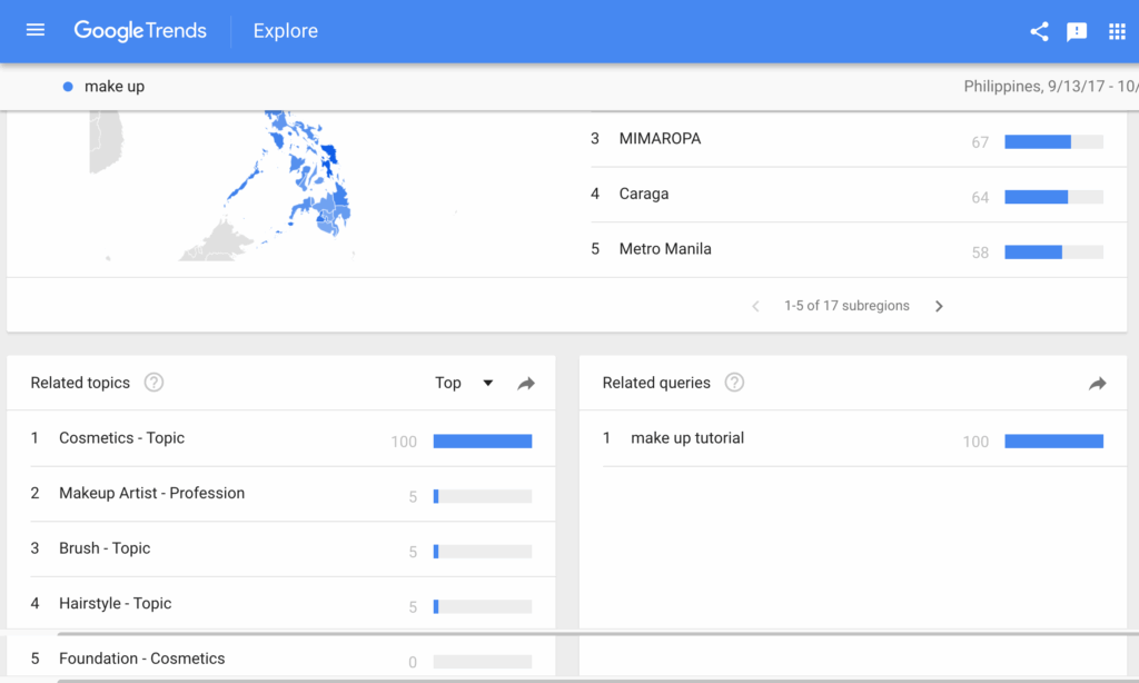 You’ll see the related topics around the keyword “make up”. It will also show you the locations who are searching it the most.